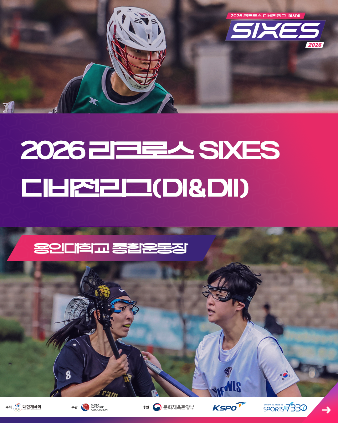 2026 라크로스 SIXES 디비전리그 개최 - 3월 22일 개막, 9월 13일까지 용인대에서 시즌 운영 - 디비전 체계 도입으로 클럽 중심 리그 구조 전환 - 문체부·대한체육회 스포츠클럽 디비전리그 사업 기반 리그 추진 |